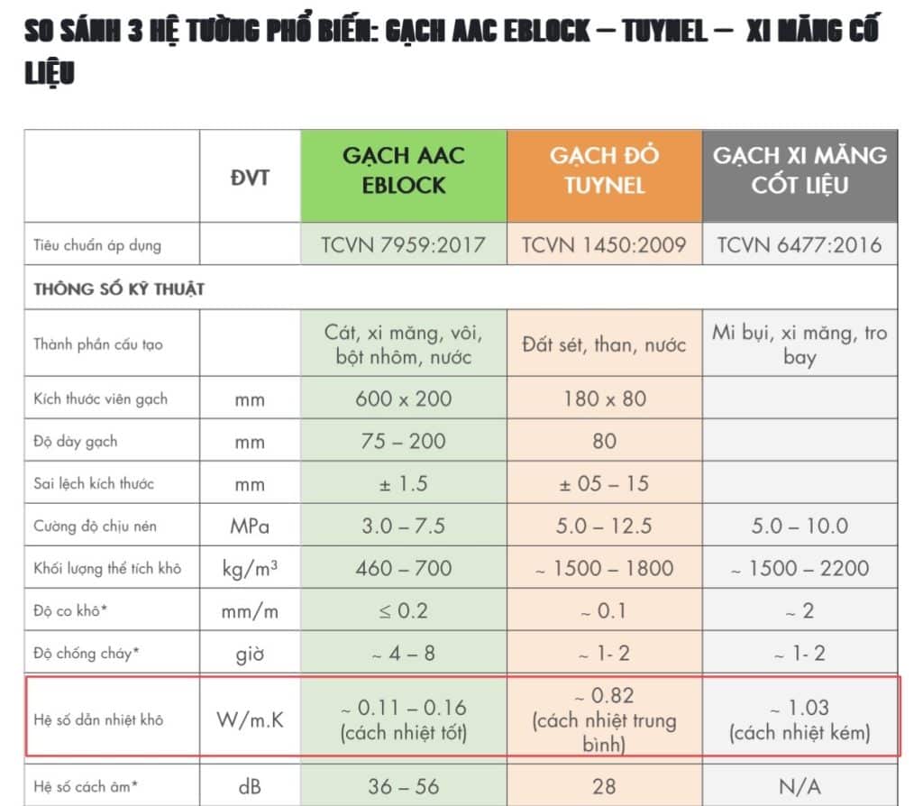 Kết luận: Khi so sánh với các loại gạch truyền thống như gạch đỏ, gạch nung, gạch AAC có khả năng cách nhiệt vượt trội hơn hẳn.