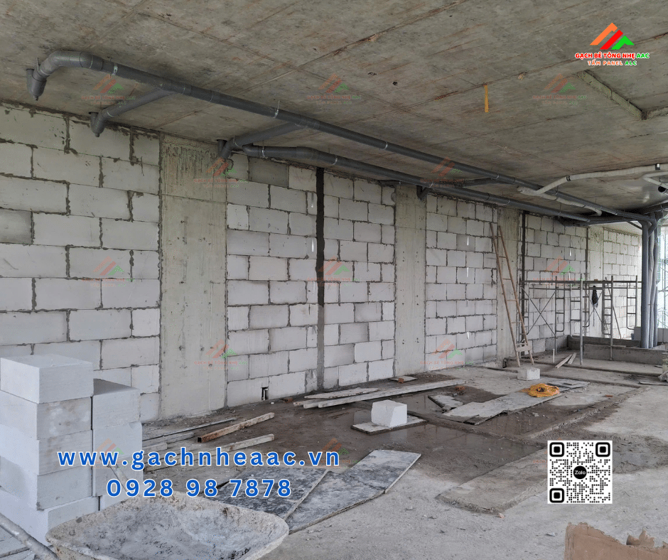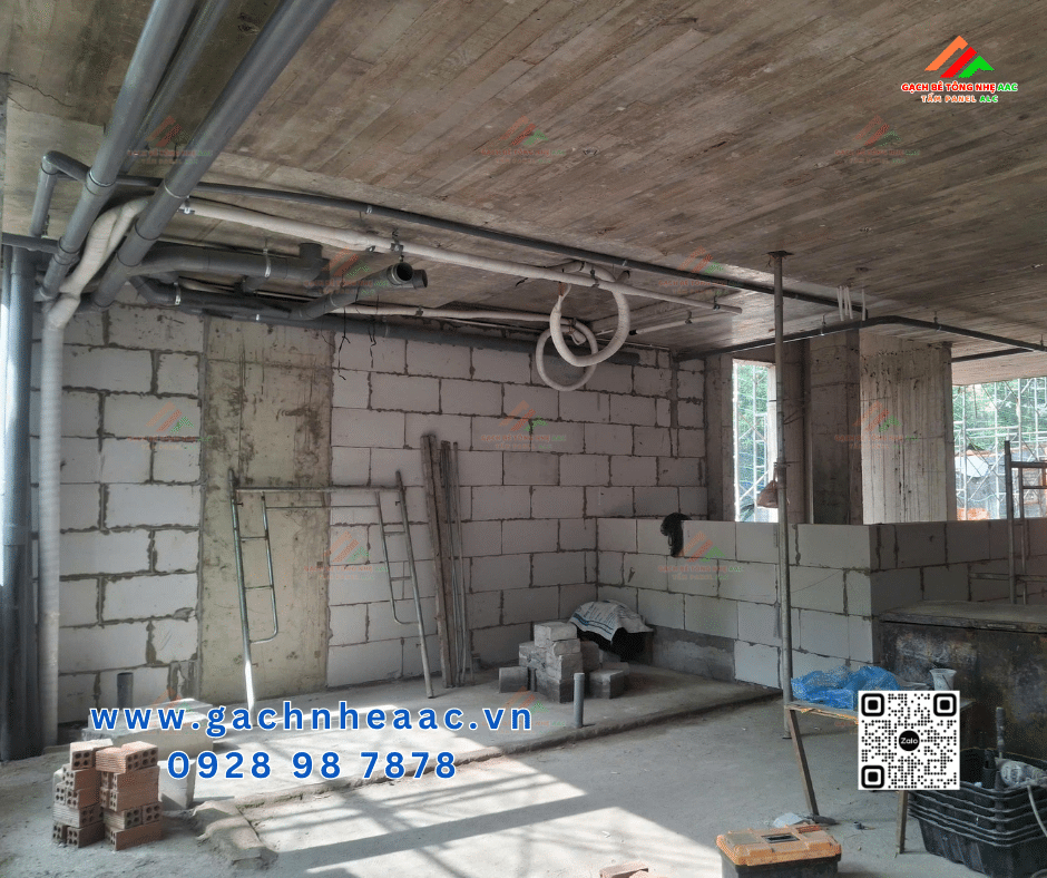 Trong dự án này, hạng mục tường xây và vách ngăn được thi công bằng gạch bê tông khí chưng áp AAC, đảm bảo khả năng chống cháy, cách âm, cách nhiệt và tối ưu tải trọng công trình.