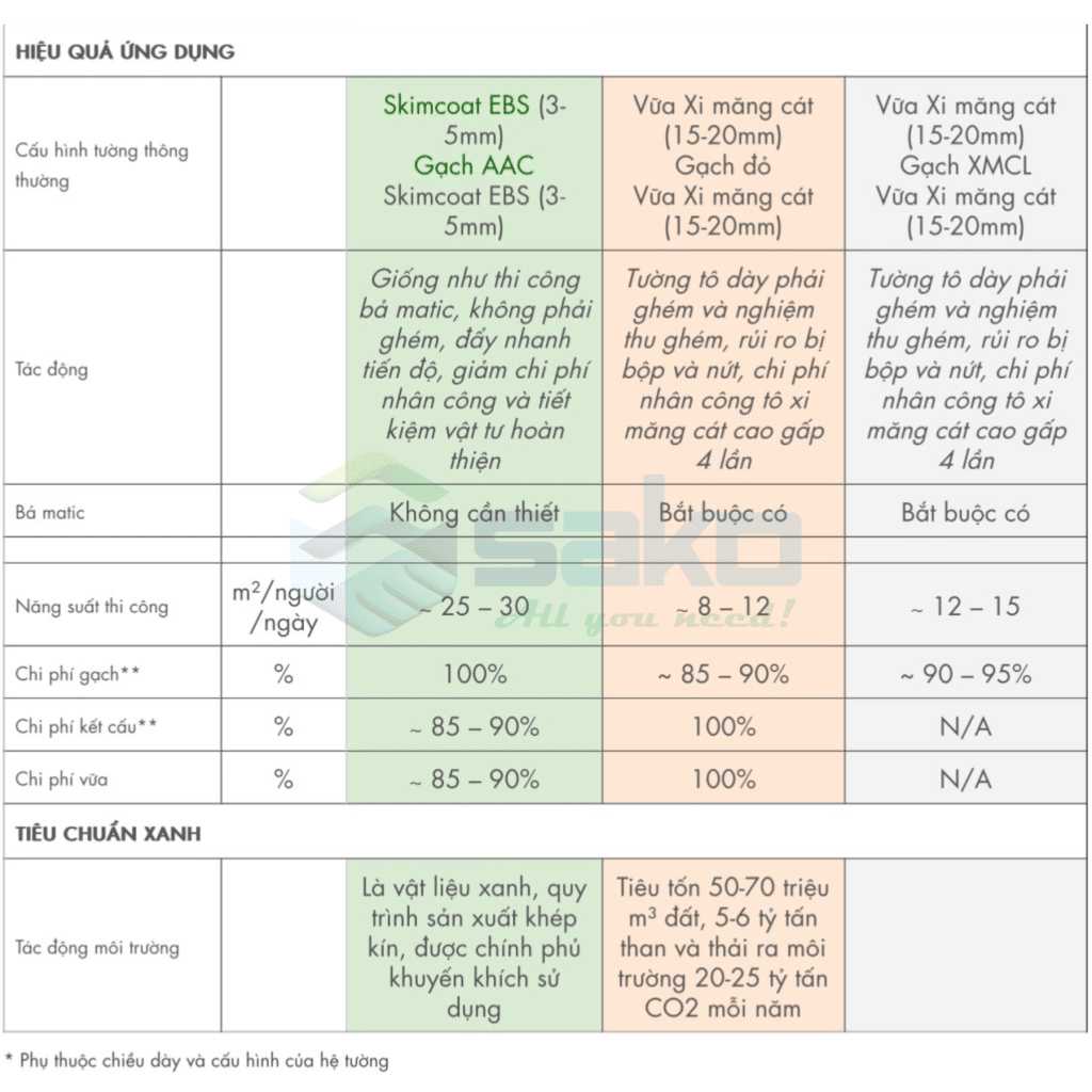 Khi tường xây sử dụng Gạch nhẹ AAC, tạo nên bề mặt tường rất phẳng, các mặt tường này sẽ giảm được công thợ tô trác rất nhiều, tiến vào sử dụng Vữa tô chuyên dụng Skimcoat EBS-300 hoặc Vữa tô chuyên dụng Skimcoat EBS-302 cùng với công đoạn sơn là đã có thể hoàn thiện hệ tường một cách nhanh và tối ưu nhất.