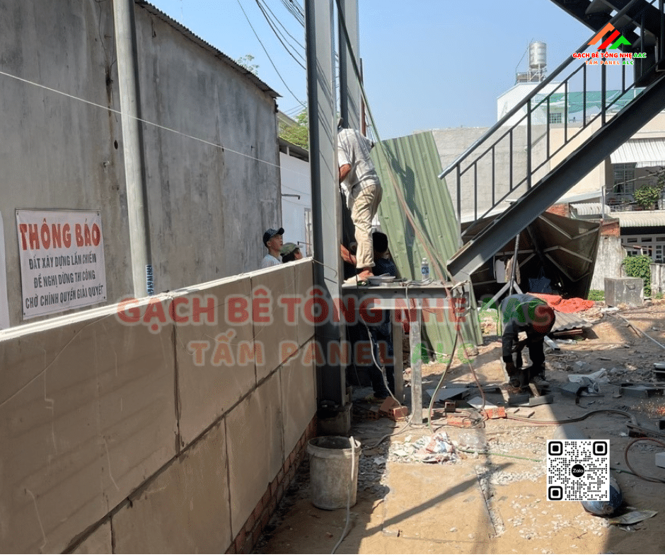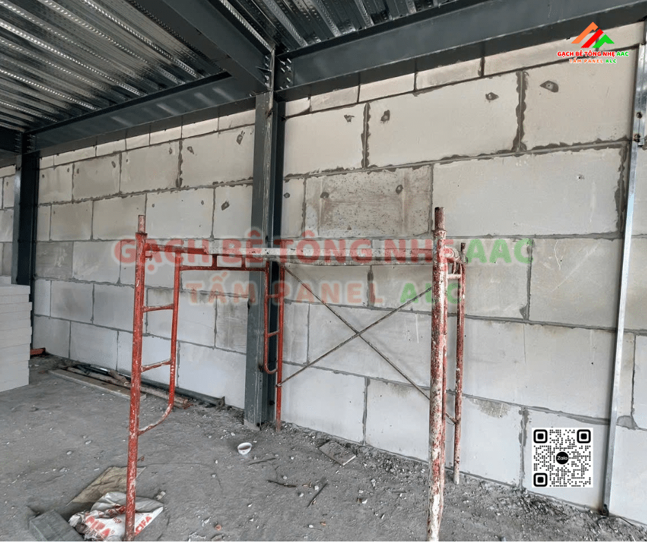 Khung thép được sản xuất sẵn tại nhà máy và vận chuyển đến công trường để lắp đặt. Sau đó, tấm bê tông nhẹ sẽ được lắp đặt vào khung thép để tạo thành kết cấu tường.