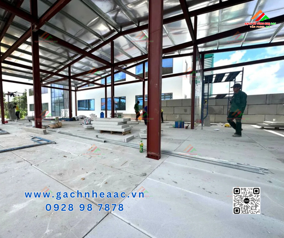 Hình ảnh thực tế cho thấy ALC được sử dụng hiệu quả trong công trình khung thép, giúp tăng tốc độ thi công và đảm bảo chất lượng đồng đều.